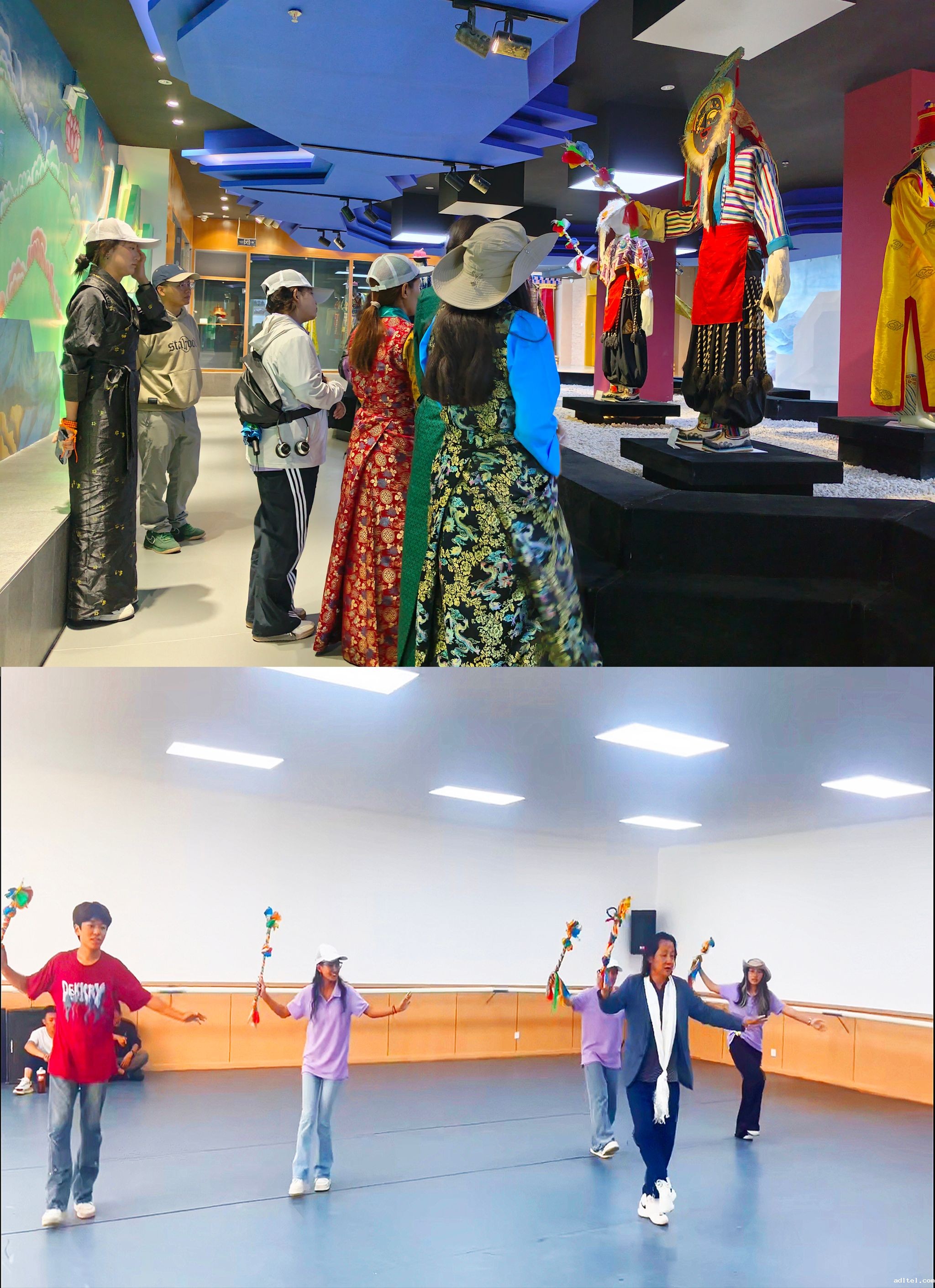 7月26日至27日,实践团开启藏戏体验之旅。藏戏融合了音乐、舞蹈与叙事,不仅是艺术表演,更是藏族人民精神世界的寄托,传递着对真善美的追求。在藏戏博物馆,在米团老师带领下,大家参观了各具特色的藏戏精美服饰、寓意各异的手工油彩面具。在体验环节,大家来到练舞室了解演员们的训练日常,老师们反复练习每一个动作,精心打磨每一个细节。演员常需一人分饰多角,以简洁的剧情演绎善恶较量;以独特的唱腔令观众如痴如醉。老师们的精湛表演让大家近距离感受到藏戏面具传情、动静生姿、穿越时空的艺术魅力。成员们有幸向老师请教藏戏分解动作,跟着老师在音乐中起舞。在学习女子在河边打水的动作时,老师惟妙惟肖地演示打水前先要四周观察的头部细节动作,让大家深刻理解了“台下十年功,台上一分钟”的含义,即便只是最简单的动作,也蕴含着藏族人民长期生活经验的总结与升华、提炼与展现,都需要长时间的练习才能掌握。更让大家体悟到藏戏并非是躺在博物馆里的古董,而是一代代人用生命延续的“活态记忆”。在采访环节,大家了解到随着社会发展,藏戏也在与时俱进;许多老师为藏戏奉献了一生,米团老师就已研习藏戏四十余年,如今还在培养下一代藏戏博物馆的讲解员。前辈们“一生深耕一事”的精神坚守深深触动了每一名成员。
